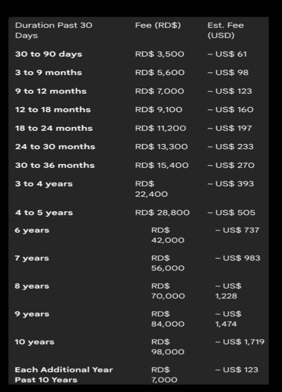 They let me know about the fee and that it could only be paid in Dominican pesos. They wouldn’t accept USD or Credit Cards.